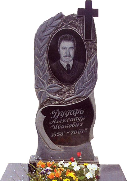 Памятник из гранита создан в форме плавной композиции, центральным звеном которой является лавровый венок как античный символ благородности, славы или мира. В верхней части плиты расположен крест, центральное место занимает гармоничная фотография усопшего. Надпись имеет лаконичное мягкое начертание. В комплекте поставляется открытая гранитная тумба.